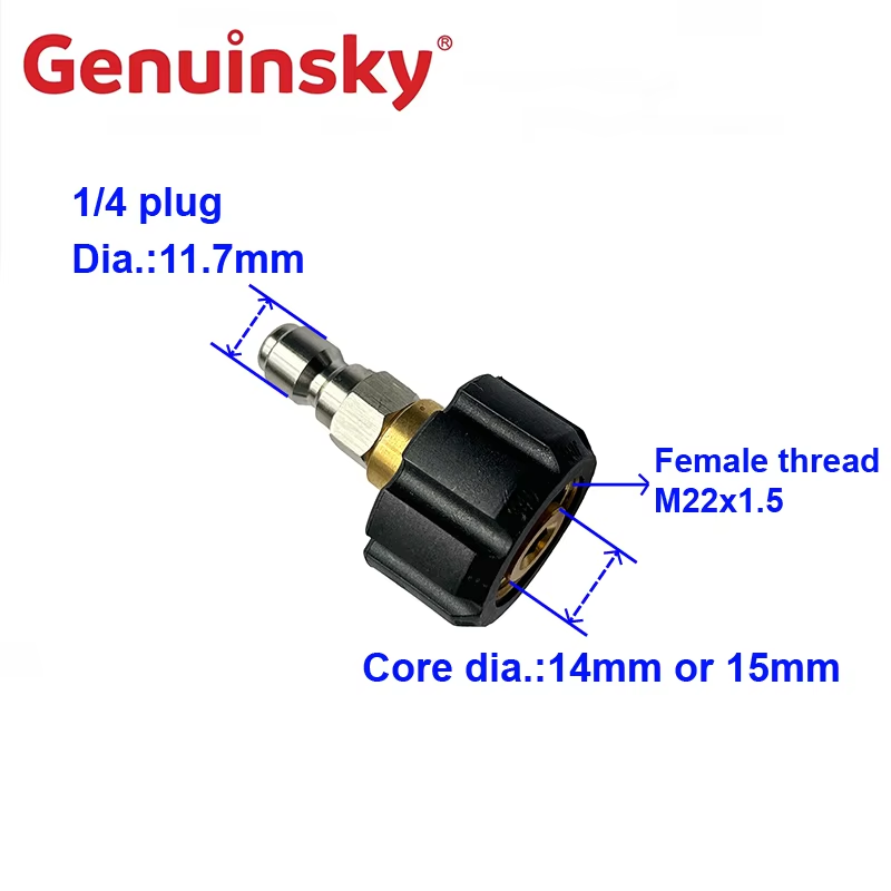 Este produto é um plugue rápido de 1/4 de polegada. Existem dois diâmetros de orifícios para escolher, DIA.14mm ou 15mm.ningbo genuinsky é uma empresa especializada na produção de acessórios de limpeza. A empresa integra desenvolvimento, produção e vendas, e a qualidade do produto é garantida. Bem -vindo à compra.