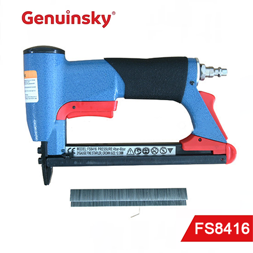 8416 O grampeador da coroa fino do ar é usado para consertar pregos em forma de U ou unhas da porta na superfície dos materiais através de dispositivos pneumáticos, como compressores de ar. É usado principalmente para o processamento e fabricação de tecidos de sofá ou materiais de couro e para o processamento rápido de lotes de emenda de material. É uma ferramenta essencial para fábricas de processamento de couro e fábricas de móveis.8416 Air grampeador Fine Crown são pistolas de unhas de ar pesadas clássicas.