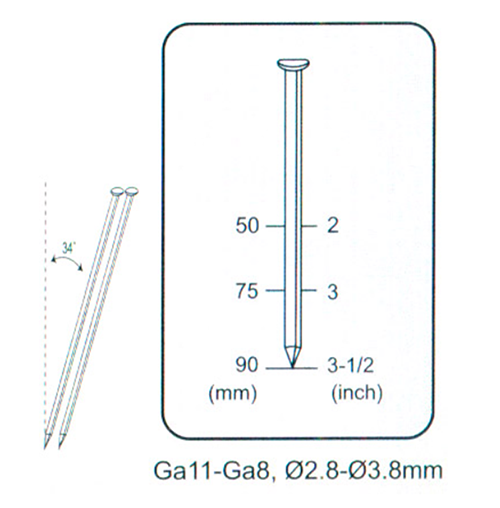 As especificações das unhas são GA11-GA8, com diâmetro de 2,8-3,8 mm e comprimentos tipicamente de 50 mm, 75 mm e 90 mm (2 polegadas, 3 polegadas, 3-1/2 polegadas). O ângulo de inclinação do arranjo da unha é de 34 graus. A profundidade da unha pode ser ajustada de acordo com as necessidades de trabalho.