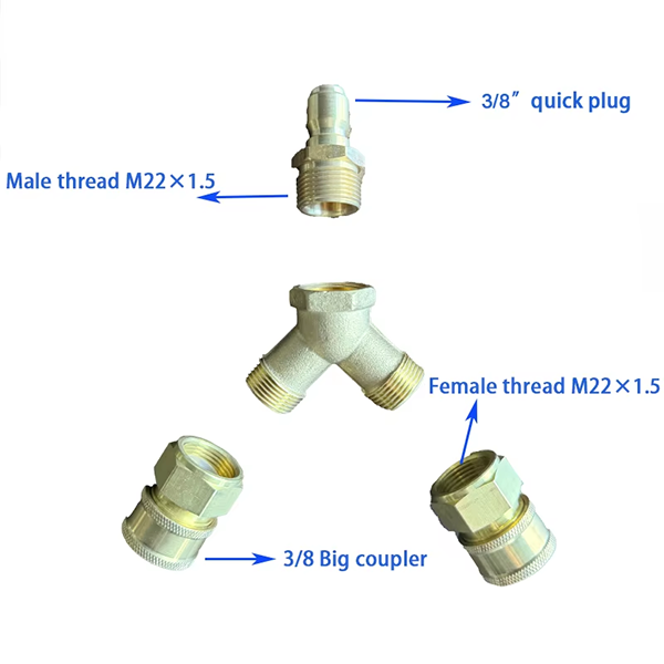 Existem dois modelos, o primeiro é um conector de três vias com acopladores de 1/4 "e 2pcs 1/4". Uma extremidade do plugue de 1/4 "possui um design rápido de plugue com um diâmetro de 11,7 mm, e a outra extremidade é o fio masculino M22 × 1,5. Uma extremidade dos dois acopladores de 1/4" é a linha feminina M22 × 1,5 e a outra extremidade é 1/4 do acoplador. O segundo é um conector de três vias com plugue de 3/8 "e 2pcs 3/8" Coupllers.3/8 "Plug. Uma extremidade também é um design rápido de plugue e a outra extremidade é masculina. Frea M22 × 1,5. Uma extremidade dos dois acopladores de 3/8" é o fio feminino M22 × 1,5, e a outra extremidade é 3/8 Big Coubler. O material é de cobre completo, que possui boa resistência à corrosão e pode manter uma conexão estável no ambiente complexo de lavagem de carros. Ao mesmo tempo, o cobre também possui uma certa força e excelente ductilidade, o que é uma opção confiável para ambientes de limpeza de alta pressão. O tamanho de 1/4 de polegada pode ser adaptado de maneira flexível às máquinas de lavar carros, armas de pulverização e outros equipamentos. A especificação de 3/8 de polegada pode ser aplicada ao uso de fluxo maior, como limpar veículos grandes ou limpar equipamentos industriais, o que melhora significativamente a eficiência da limpeza.