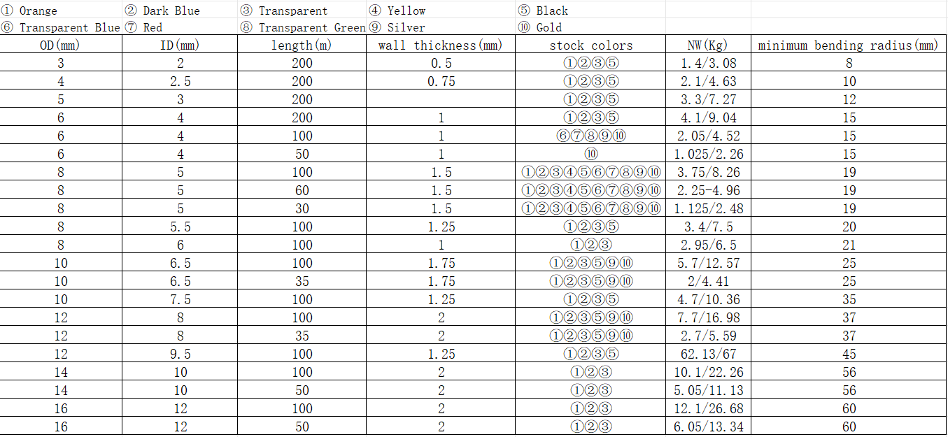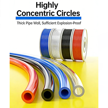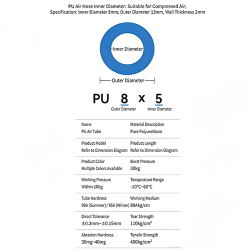 Em primeiro lugar, a partir dos parâmetros principais, a mangueira de ar à prova de explosão de PU de alta pureza é especialmente projetada para transmissão de ar comprimido. A especificação principal do produto é PU 8 × 5 (diâmetro interno 8 mm, diâmetro externo 12 mm, espessura da parede 2 mm), que pode se adaptar às necessidades de interface da maioria das ferramentas pneumáticas e equipamentos de automação do mercado. Sua própria estrutura altamente concêntrica pode garantir a transmissão estável do fluxo de ar e, ao mesmo tempo, pode fazer com que a própria traqueia tenha melhor resistência à explosão. No campo da fabricação de automóveis e montagem de componentes eletrônicos, os requisitos de segurança e estabilidade para tubulações são relativamente altos, por isso a estabilidade da traqueia é muito importante.