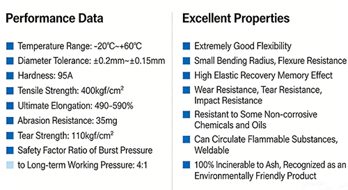 Em segundo lugar, a partir do desempenho principal, a faixa de temperatura de trabalho da mangueira de ar à prova de explosão de PU de alta pureza pode cobrir -20 ℃ ~ 60 ℃, a pressão de trabalho pode chegar a 10 kgf e o coeficiente de segurança da pressão de jateamento e pressão de trabalho é 4: 1. Excedendo em muito os padrões básicos da indústria, pode evitar o risco de estouro de tubos em cenários de uso de alta pressão, para que possa se adaptar à grande maioria dos ambientes industriais.