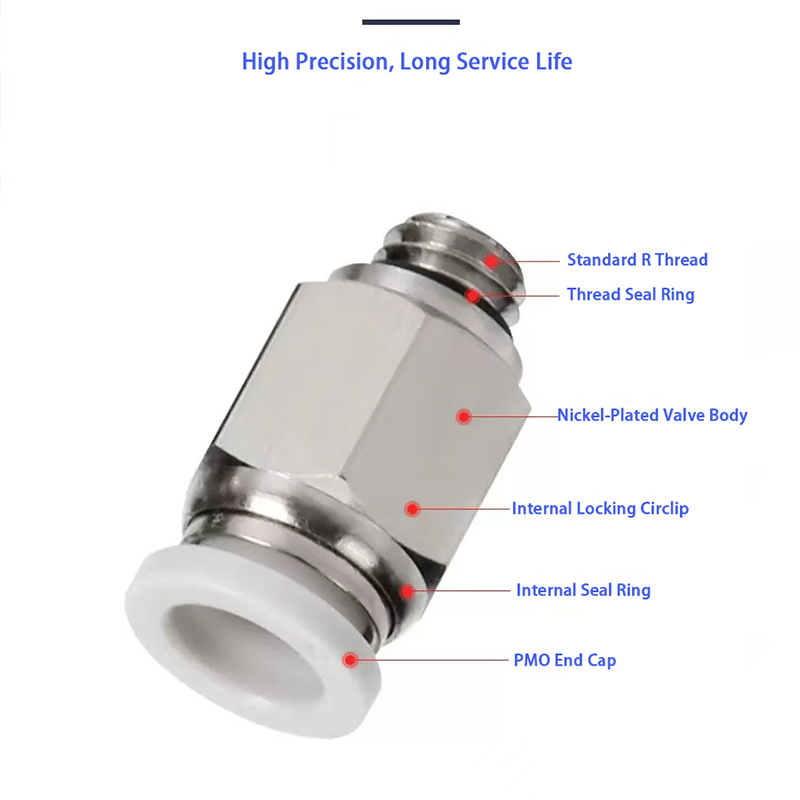 O design da série Micro Mini Connector pode atender com precisão às necessidades das operações industriais e é especialmente projetado para sistemas pneumáticos de precisão. Contém uma grande variedade de produtos, incluindo juntas em ângulo reto, através de juntas e válvulas borboleta, que podem ser adaptadas à traqueia de PU e tubos de náilon, que são os principais tubos do mercado. A julgar pelo design geral do produto, a junta em si é um corpo de válvula feito de cobre niquelado. O material de cobre niquelado não só possui excelente vedação do material de cobre, mas também possui boa resistência à corrosão da camada niquelada.