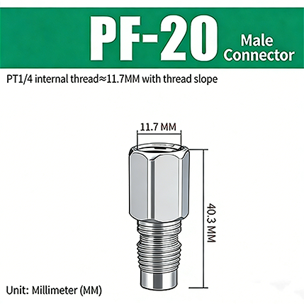 1.PF-20. rosca de tubo 1/4, com inclinação de rosca, o diâmetro da parte roscada é de cerca de 11,7 mm e o comprimento total do produto é de 40,3 mm.