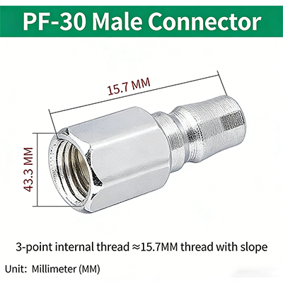 2.PF-30. Rosca de tubo britânica G3/8", com inclinação da rosca, o diâmetro da parte da rosca é de cerca de 15,7 mm e o comprimento total do produto é de 43,3 mm.