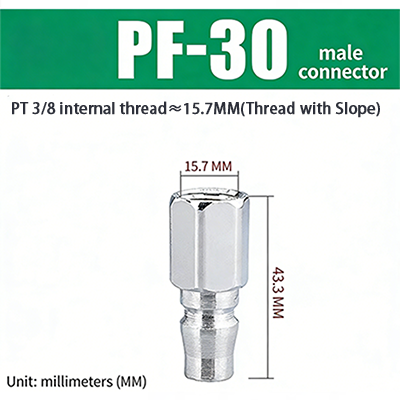 2.PF-30. rosca de tubo 3/8, com inclinação de rosca, o diâmetro da parte roscada é de cerca de 15,7 mm e o comprimento total do produto é de 43,3 mm.
