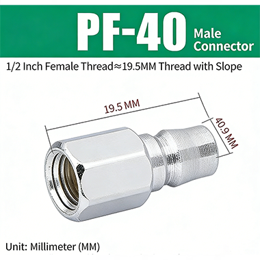 3.PF-40. Rosca de tubo britânica G1/2", com inclinação da rosca, o diâmetro da parte da rosca é de cerca de 19,5 mm e o comprimento total do produto é de 40,9 mm.