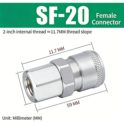 1. SF-20. A rosca do tubo imperial é G1/4", o diâmetro da parte roscada é de cerca de 11,7 mm e o comprimento total do produto é de 59 mm.