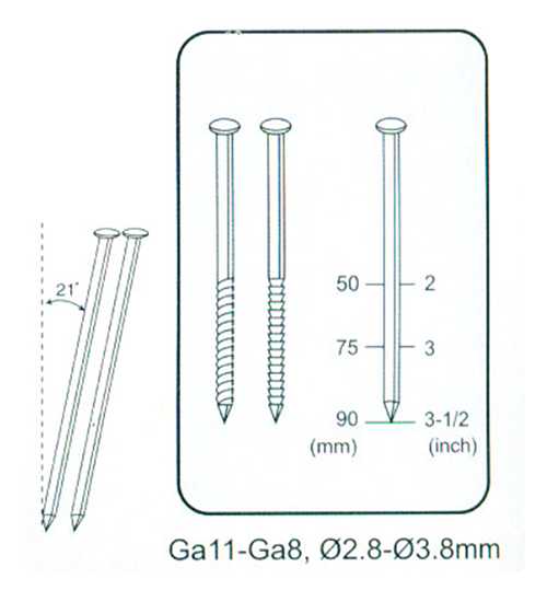 As especificações das unhas são GA11-GA8, com diâmetro de 2,8-3,8 mm e comprimentos tipicamente de 50 mm, 75 mm e 90 mm (2 polegadas, 3 polegadas, 3-1/2 polegadas). O ângulo de inclinação do arranjo das unhas é de 21 graus. A profundidade da unha pode ser ajustada de acordo com as necessidades de trabalho.